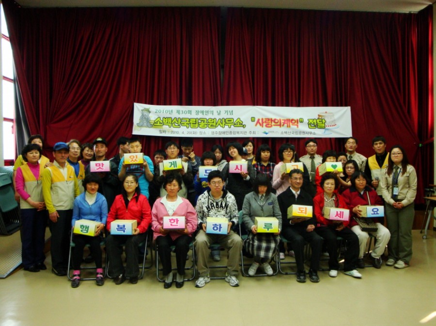 소백산국립공원에서 2010년 4월 20일 오후2시부터 5시까지 제30회 장애인의 날을 맞이하여 손수만든 케익을 전달하고 즐거운 레크리에이션시간과 다과회를 준비하였습니다.