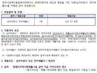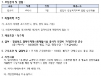 영주시장애인종합복지관 직원(심리치료사, 언어재활사) 모집 공고 영주시장애인종합복지관에서는 장애인복지에 관심과 열정을 가진 직원(심리치료사, 언어재활사)을 아래와 같이 모집합니다. 1. 모집분야 및 인원 : 분야 / 채용구분인원채용사유심리치료사 / 정규직언어재활사 / 정규직 각 1명심리치료사 / 전임자 보직변경으로 인한 채용 언어재활사 / 신규 TO 인원 부분 채용 2. 지원자격 요건 가. 심리치료사: 관련학과 졸업자, 관련자격증 소지자[임상심리사, 재활심리사(한국재활심리사협회), 행동치료사(한국정서·행동장애아교육학회), 놀이치료사(한국아동심리재활학회, 한국놀이치료학회), 미술치료사(한국미술치료학회), 심리운동사(한국심리운동협회), 장애아동복지지원법 시행규칙 제8조(별표1) 제공인력의 자격기준을 갖추고 장애인 재활지원 경험 1,000시간 이상인자], 심리진단 및 평가 가능자 우대 나. 언어재활사: 관련학과 졸업자, 관련자격증 소지자[언어재활사 자격증(보건복지부)], 진단 및 평가 가능자 우대 다. 사회복지사업법 제35조의2 제2항의 결격사유에 해당되지 않는 자 3. 채용조건 : 심리치료사, 언어재활사 / 정규직 4. 급여 : 장애인지역사회재활시설 급여 지급 가이드라인 준수 (종사자수당 – 매월 140,000원 별도 지급, 명절휴가비 기본급 × 60%) 5. 근무조건 : 주 5일 근무(09:00 ~ 18:00) 6. 지원서류 가. 입사지원서 1부.(본관 소정양식)-기재한 사항에 대해서는 서류전형 합격 후 별도의 증빙자료를 제출받아 사실여부를 확인 할 예정이니 증빙 가능한 사실만 기재 나. 자기소개서(A4용지 2매 내외) 1부. 다. 개인정보제공 이용·동의서 ※ 지원서류에 학교명, 종교, 사진, 추천인, 주민등록번호 등의 정보를 기재하지 말 것 * 자세한 사항은 첨부된 채용공고문을 확인해주세요!