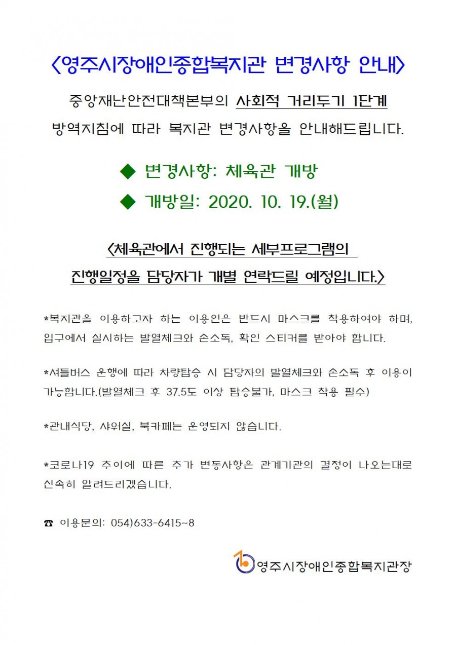 사회적거리두기 1단계 방역지침으로 인한 복지관 변경사항 안내