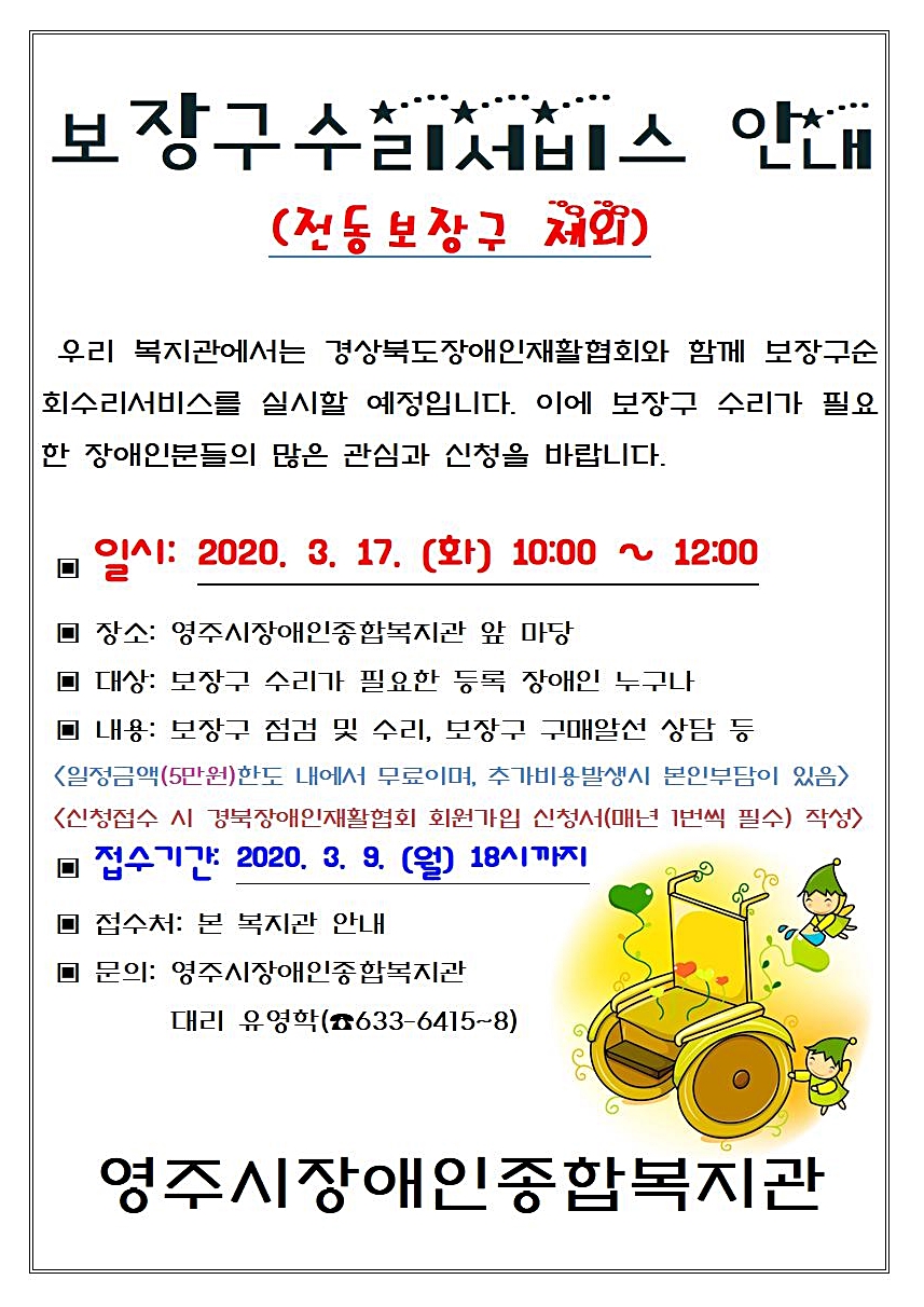 [2020]보장구수리 참여자 모집 안내 페이지 정보 작성자 유영학 작성일 20-02-10 13:54 조회6,313회 댓글0건 본문 많은 참여 부탁드립니다.*^^* 이전글 다음글 목록