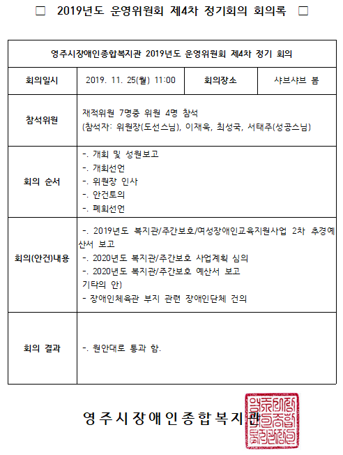 2019년도 운영위원회 제4차 정기회의 결과 공지