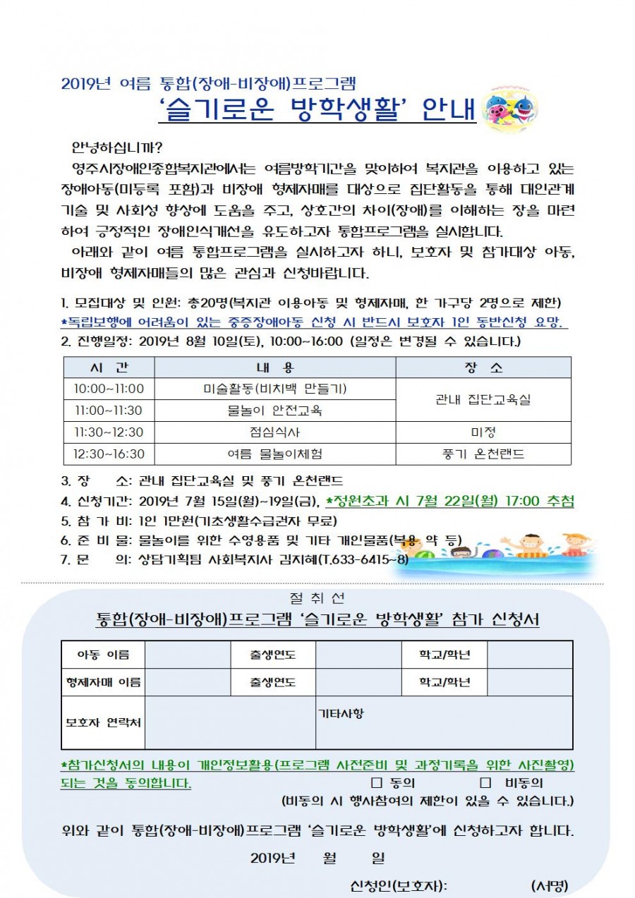 2019년 장애-비장애 통합프로그램 '슬기로운 방학생활' 참가자 모집 안내