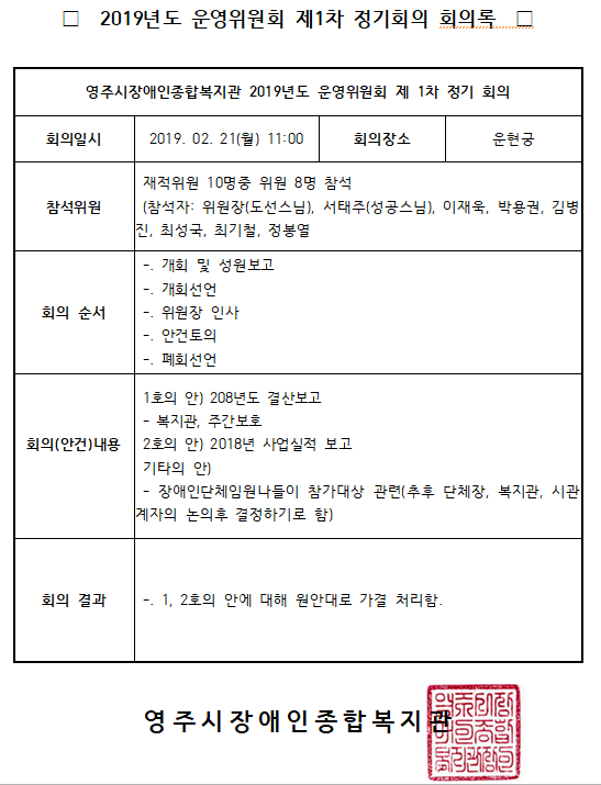 2019년도 운영위원회 제1차 정기회의 결과 공지
