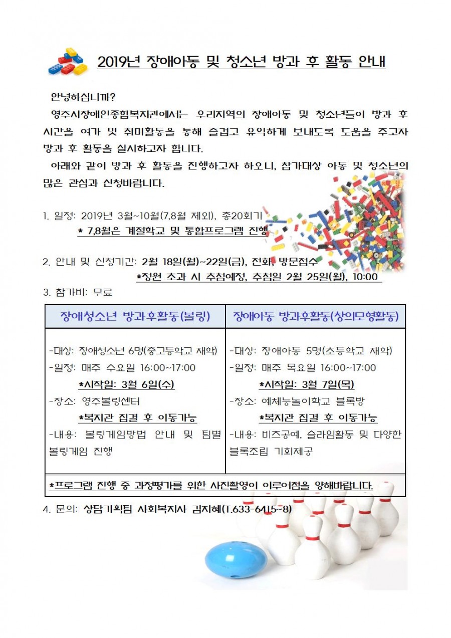 2019년 장애아동 및 청소년 방과 후 활동 참가자 모집 안내