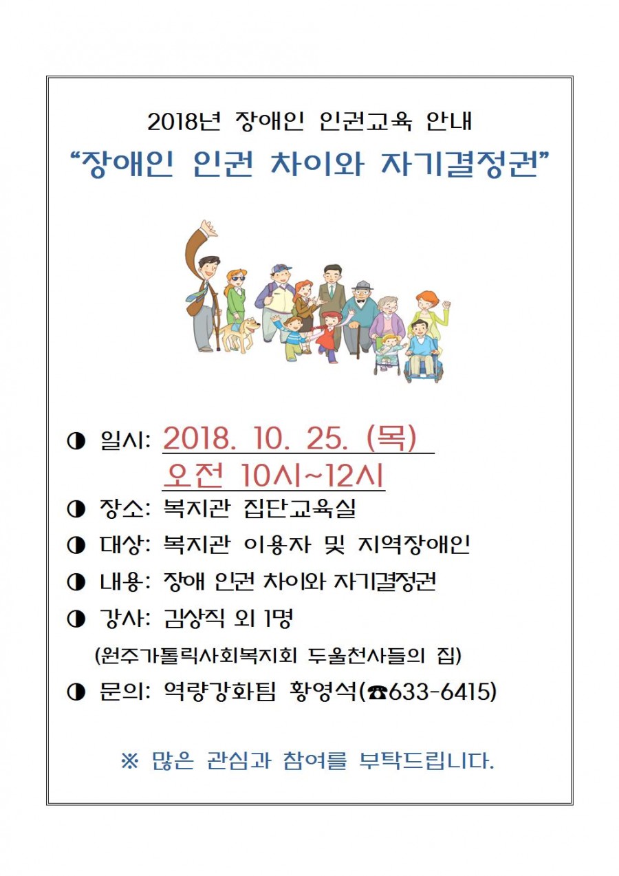 2018년도 영주시장애인종합복지관 장애인 인권 교육 일정 변경 안내