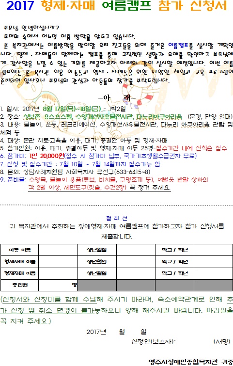 복지관 이용 아동과 형제들이 1박2일동안 부모님의 곁을 떠나 가족의 소중함을 느끼고, 자립성을 키울 수 있도록 많은 참여 바랍니다~