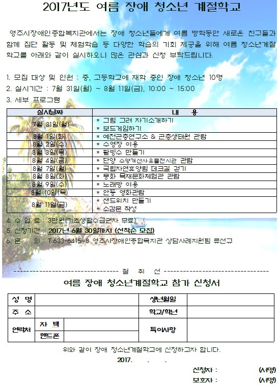 여름방학 동안 장애 청소년들이 즐겁게 지낼 수 있도록 많은 참여 바랍니다^^