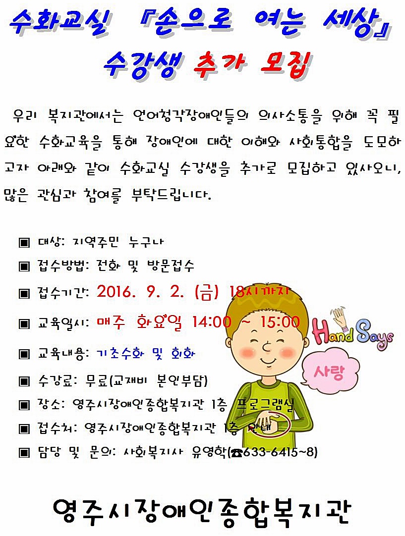 수화교실 『손으로 여는 세상』 수강생 모집 안내