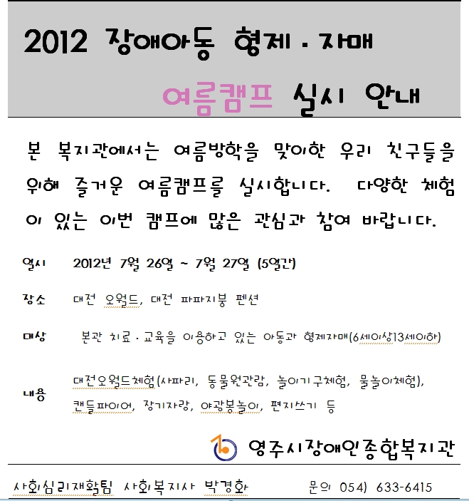 2012 장애아동 형제자매 여름캠프 실시 안내