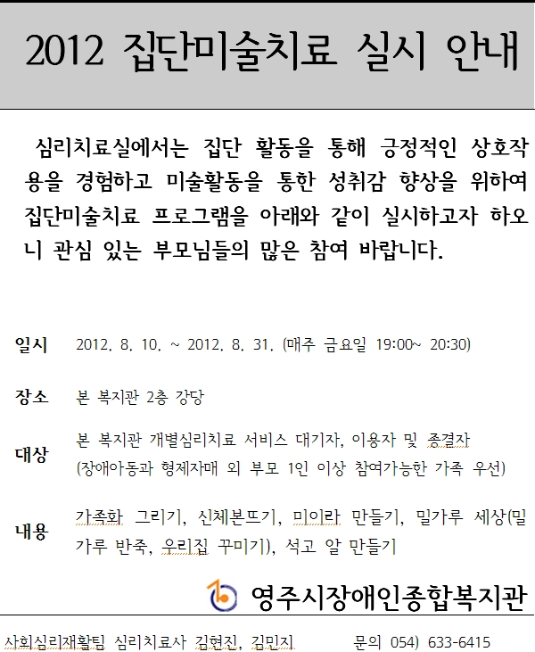 경상북도 영주시 원당로 52번길 25 영주시장애인종합복지관대표번호 : 054-633-6415~8 팩스: 054-633-6419이메일: yjrehab@yjrehab.or.kr
