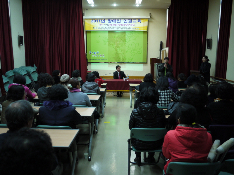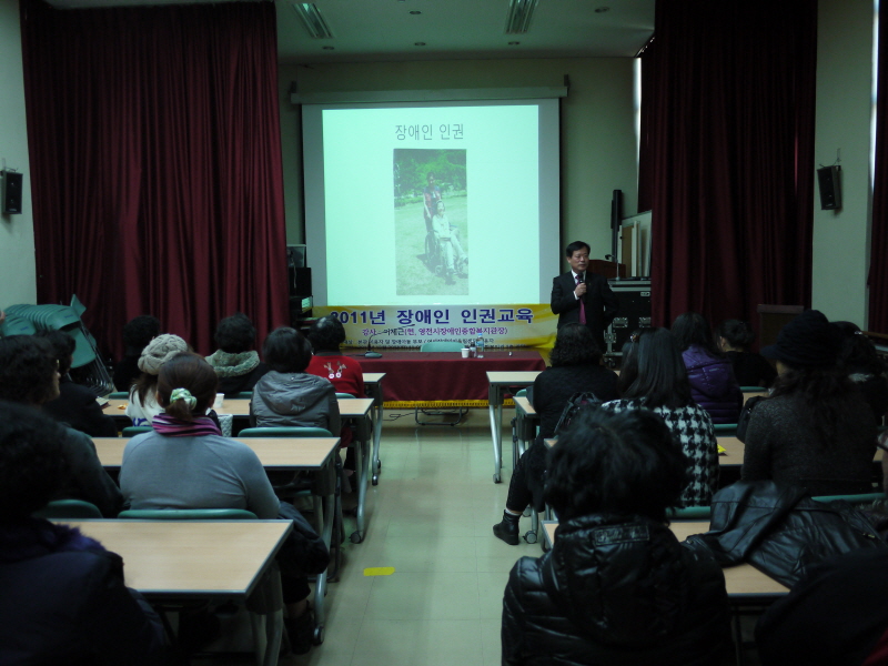 영주시장애인종합복지관에서는 복지관 이용 장애인과 장애아동 부모님 및 어울림센터 여성장애인들을 모시고 장애인 인권교육(2011년 12월 20일 화요일, 오전 11시부터 12시40분까지)을 실시하였습니다. 추운 날씨에도 불구하고 교육에 참석해 주신 모든 분들께 감사드립니다.
