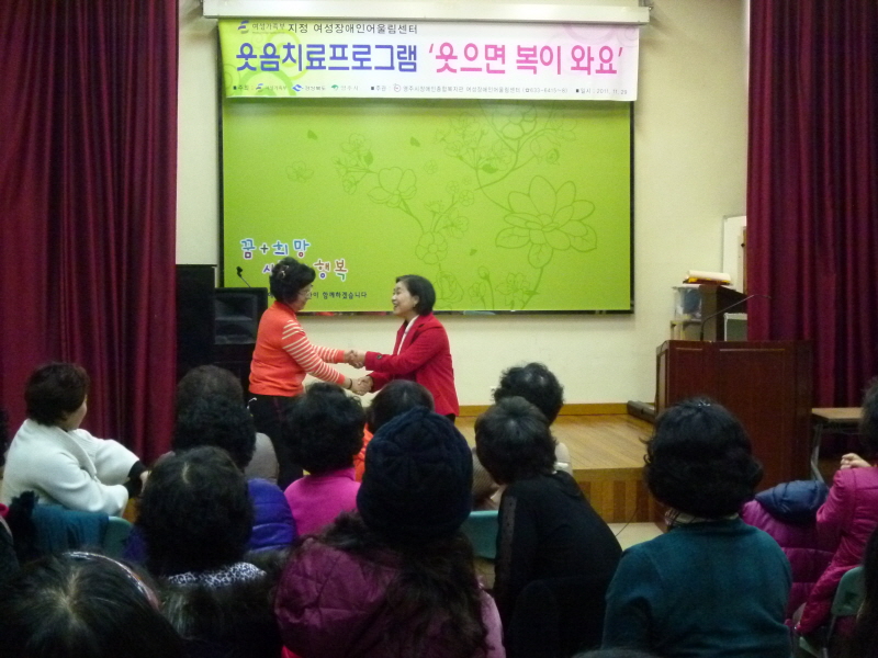 <후기>웃음치료프로그램-어울림센터 페이지 정보 작성자 이승희 작성일 11-11-29 17:33 조회5,620회 댓글0건 본문 여성장애인어울림센터 이용자를 대상으로 "웃으면 복이와요" 웃음치료 프로그램을 실시하였습니다. 맘껏 웃으면서평소에 누적된 스트레스는 물론 우울한 기분을 떨쳐버리고 복 뿐만 아니라 사랑과 건강도 얻는 소중한 시간이었습니다. 이전글 다음글 목록