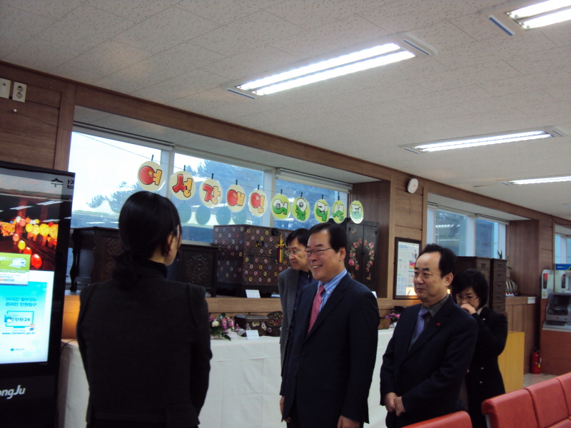바쁜 시정에도 불구하고 시청민원실에서 현재 진행 중인 제2회여성장애인어울림센터 작품전시회를 관람하고 계시는 김주영시장님의 모습입니다.