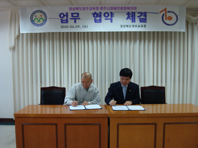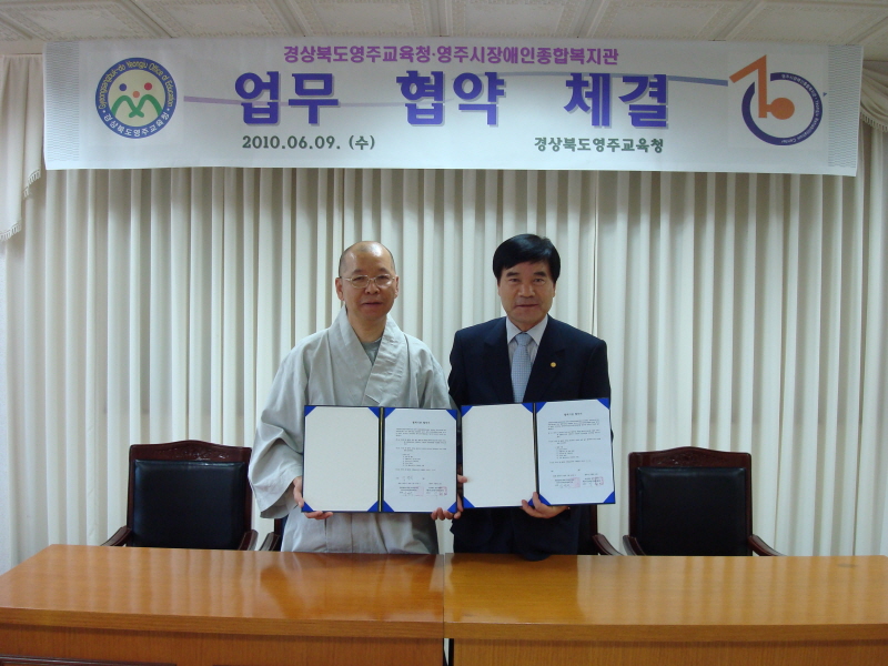 -본 복지관 관장님이신 도륜스님과 영주교육청 박상오 교육장님 협약서에 서명하시는 모습-