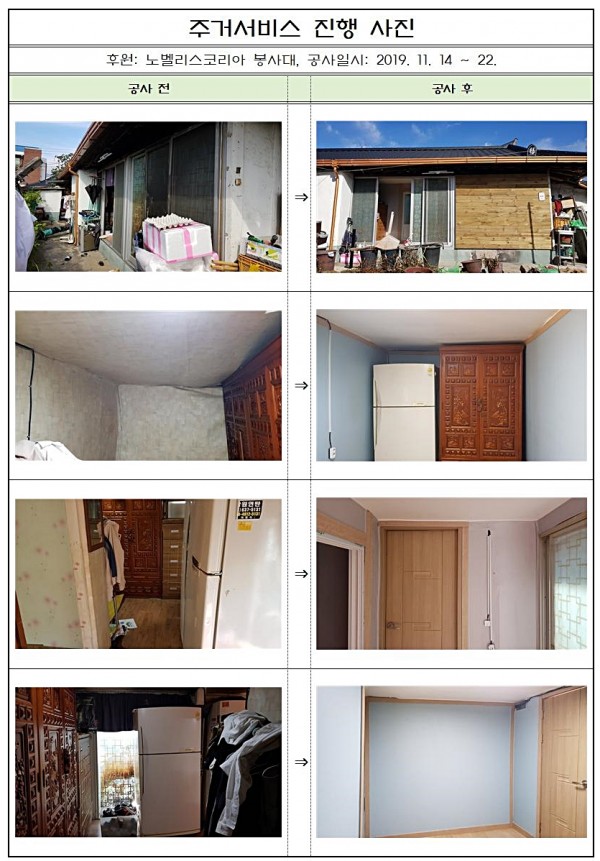 2019년 사랑의 집수리로 노벨리스코리아 봉사대와 함께 사랑의 집수리를 진행하였습니다. 노벨리스코리아 봉사대에서 집수리 비용에 대한 후원을 해 주셨고, 11월 20일 현장에 직접 방문하여 집수리에 대한 도움을 주셨습니다.