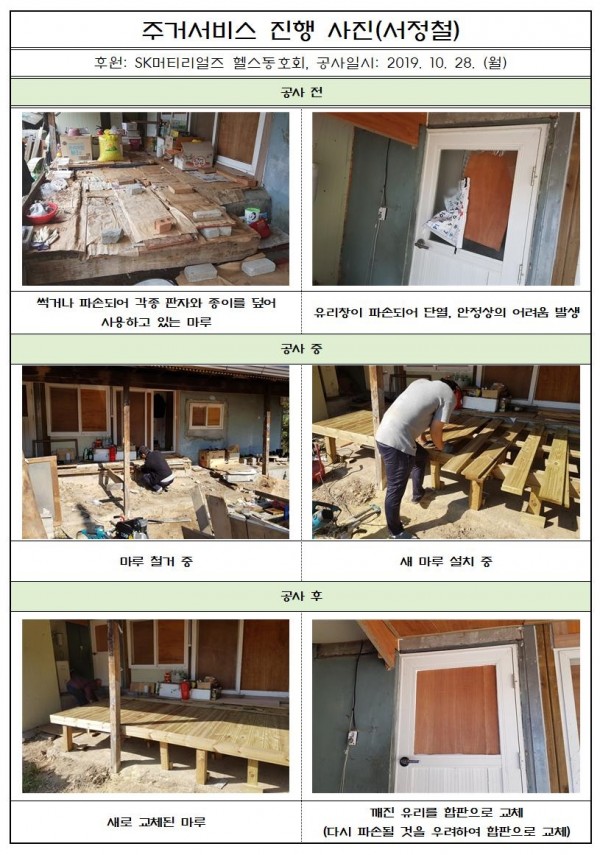 주거서비스는 낡고 오래되어 일부 파손되거나 썩어 사용의 불편과 안정상에 어려움이 있는 마루를 교체하였으며, 출입문의 유리창이 파손되어 위험의 큰 깨진 유리를 제거하고 잘 파손이 되지 않는 합판(유리창이 자주 파손되어 합판으로 교체를 결정함)으로 교체하여 진행되었습니다.