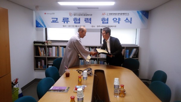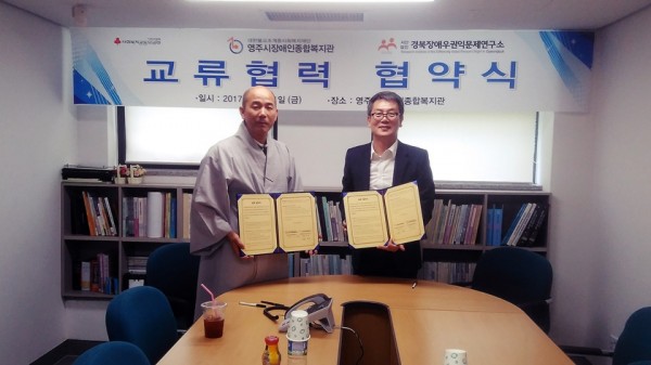 우리 영주시장애인종합복지관에서는 장애인의 권익옹호와 권리구제 향상을 위해 2017년 9월 1일(금) 경북장애우권익문제연구소와 업무협약을 체결하고 상호간의 협력체계를 구축하였습니다.