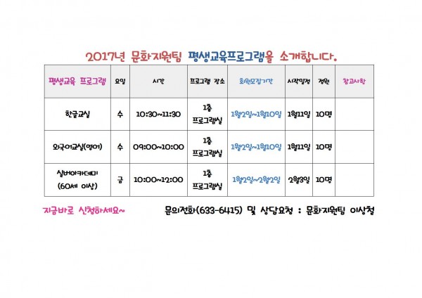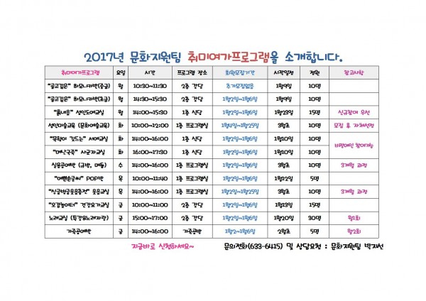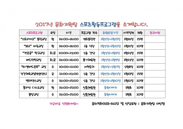 2017년 문화지원팀 프로그램을 소개 합니다.(스포츠, 취미여가, 평생교육 등)