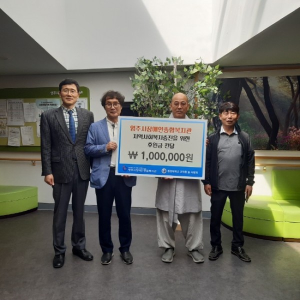 동양대학교 교직원 봉사단체 ‘늘사랑회’는 5월 26일(화), 10시 영주시장애인종합복지관에서 지역장애인의 사회통합을 지지하기 위한 업무협약서를 체결하였으며, 후원금(금1,000,000원)을 전달하였습니다. 동양대학교 교직원들로 구성된 ‘늘사랑회’(회장 이재기)는 약25년 간 우리지역의 어려운 이웃을 위한 봉사활동과 후원을 아끼지 않는 단체입니다.