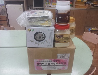 내 용: 현대자동차그룹의 후원과 사회복지공동모금회의 지원으로 저소득 장애인 10세대를 선정하여 건강증진 물품을 전달하였습니다.