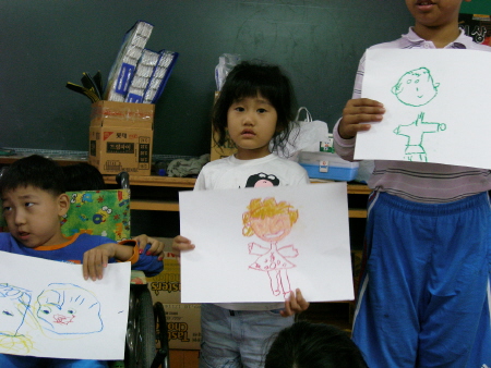 둘이 서로 짝궁을 만들어 한명이 눈을 감고 짝궁이 옆에서 설명해주며 그림그리기를 했습니다.