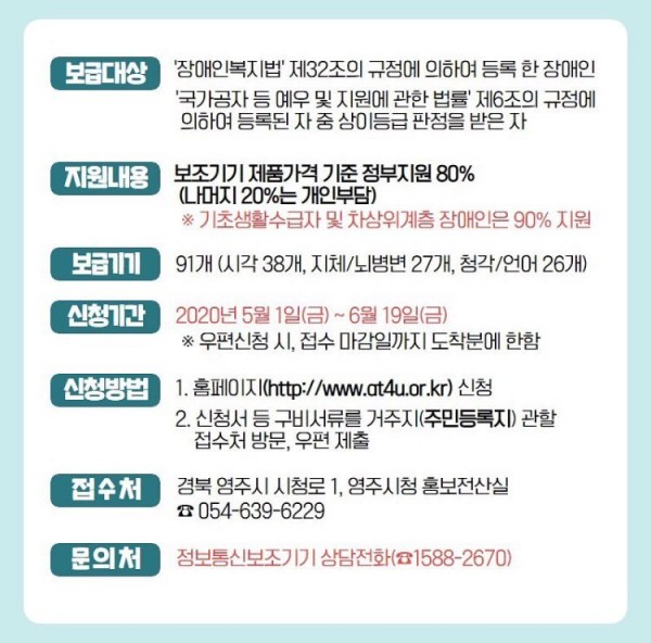 2020년 정보통신보조기기 보급사업 신청안내 페이지 정보 작성자 김지혜 작성일 20-05-14 10:29 조회3,181회 댓글0건 본문 -출처: 영주시청 인스타그램 이전글 다음글 목록