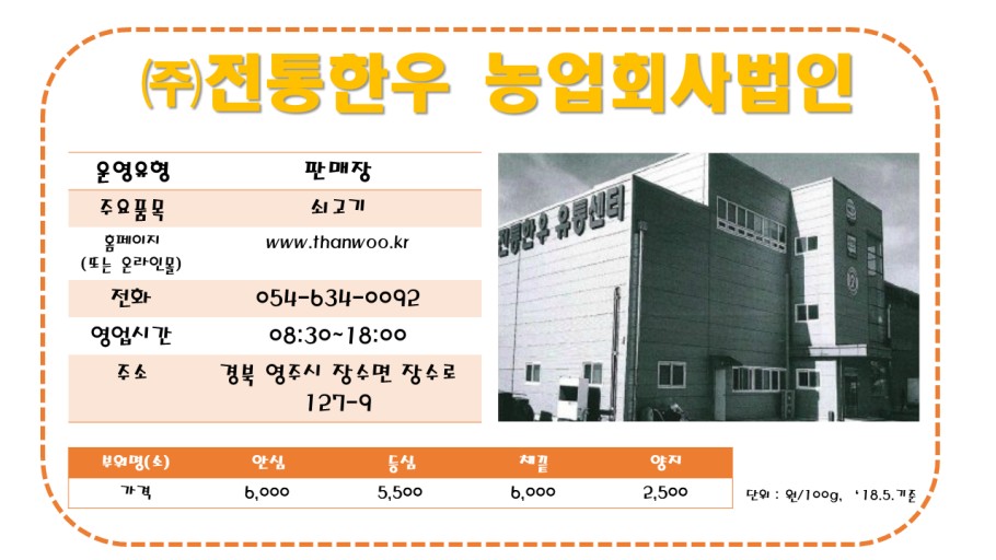 (주)전통한우 농업회사법인 페이지 정보 작성자 황영석 작성일 21-05-03 16:28 조회2,456회 댓글0건 본문 상호 (주)전통한우 농업회사법인 업종 식육점 주소 경북 영주시 장수면 장수로 127-9 주소분류 장수면 상태 분양중 위치 일진베어링 건너편 연락처 054-634-0092 업체 지도 이전글 다음글 목록